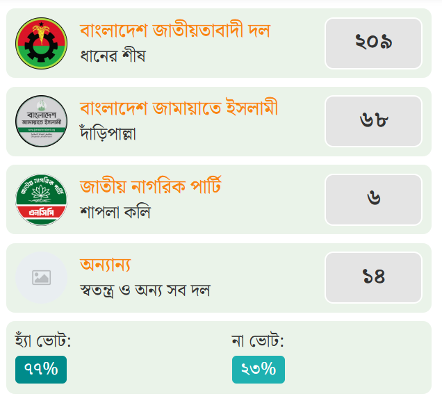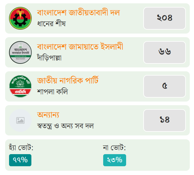 নাটোরের চারটি সংসদীয় আসনে স্থানীয়ভাবে প্রাপ্ত ফলাফলে বিএনপি মনোনীত ধানের শীষের প্রার্থীরা বিজয়ী হয়েছেন। বিজয়ীরা হলেন- নাটোর-১ (লালপুর-বাগাতিপাড়া) আসনে ব্যারিস্টার