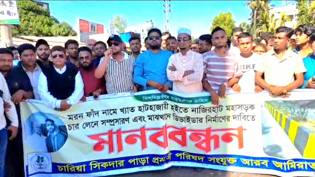 হাটহাজারীতে সড়ক সম্প্রসারনের দাবীতে মানববন্ধন ও সড়ক অবরোধ