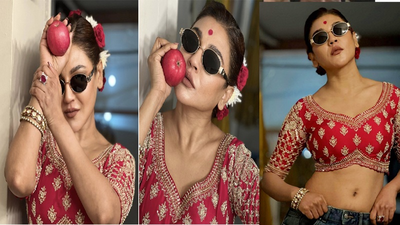 লাল ব্লাউজ ও ধূসর জিন্সে নজর কেড়েছেন নায়িকা
