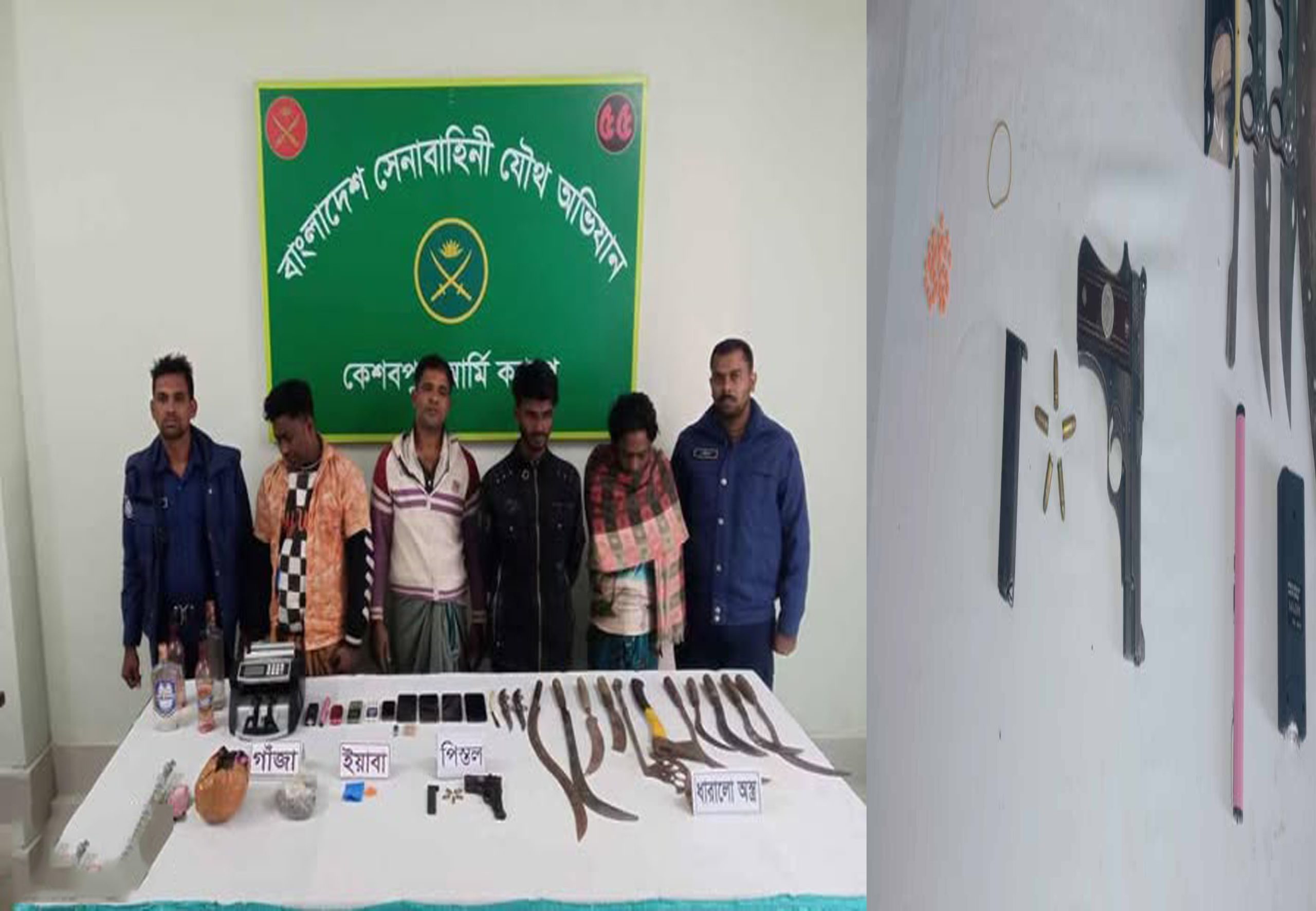 কেশবপুরে সেনাবাহিনীর অভিযানে অবৈধ অস্ত্র, মাদক ও সরঞ্জাম উদ্ধার: গ্রেফতার ৪