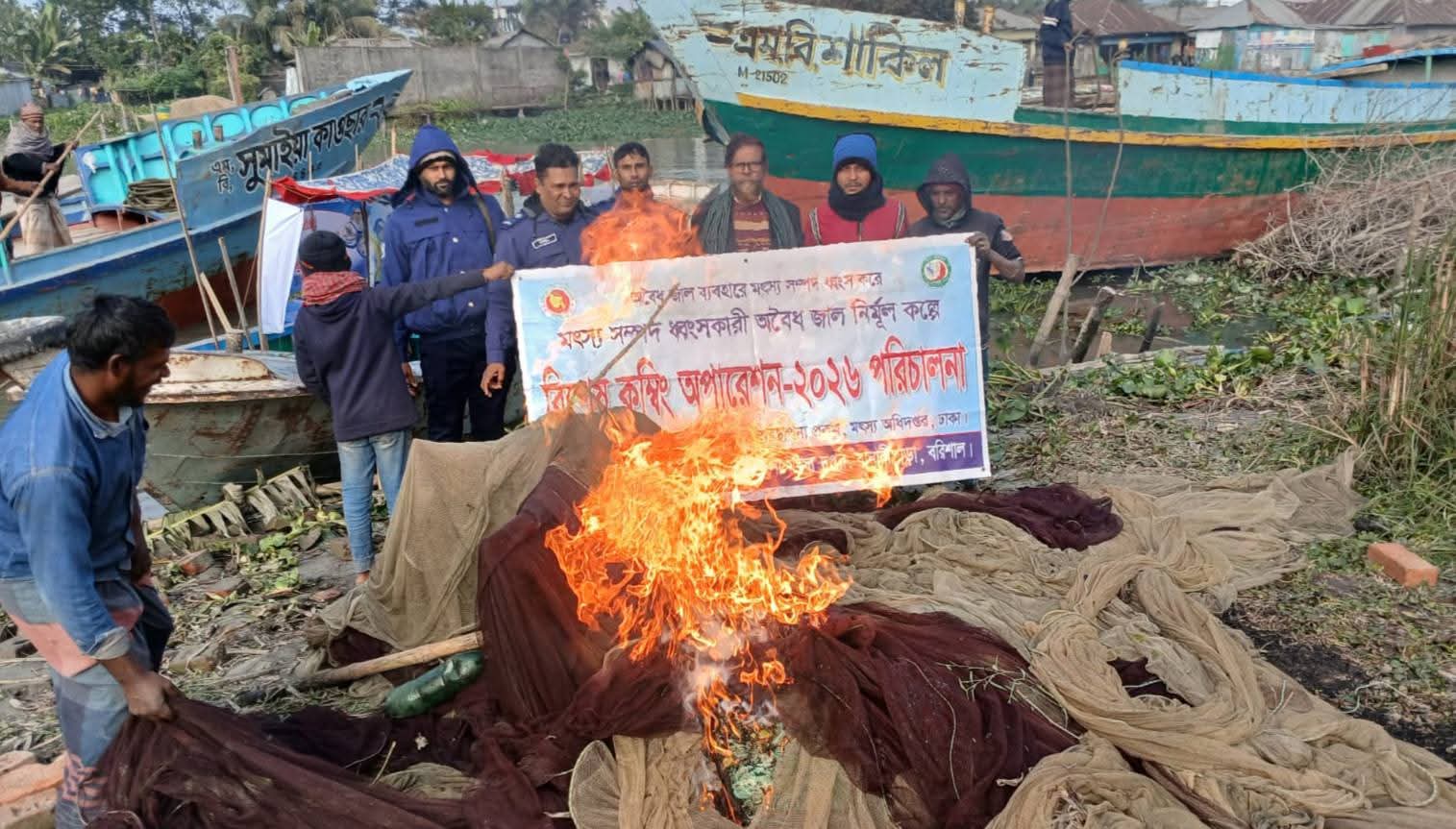 বরিশালে নিষিদ্ধ ঘোষিত সকল প্রকার অবৈধ জাল উদ্ধারে বিশেষ কম্বিং অভিযান