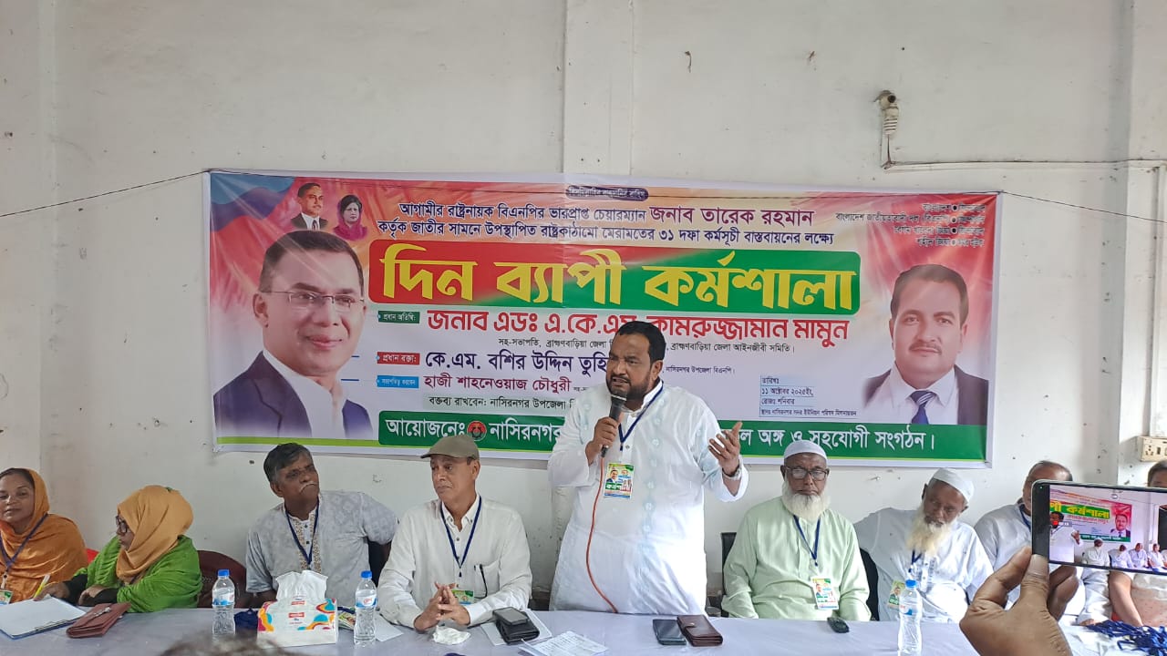 বিএনপির ভারপ্রাপ্ত চেয়ারম্যান জনাব তারেক রহমান কর্তৃক জাতির সামনে উপস্থাপিত রাষ্ট্র কাঠামো মেরামতের ৩১ দফা বাস্তবায়নের লক্ষ্যে নাসিরনগর উপজেলা বিএনপির উদ্যোগে দিনব্যাপী কর্মশালা অনুষ্ঠিত হয়েছে। শনিবার (১১ অক্টোবর ) সকাল থেকে বিকেল পর্যন্ত নাসিরনগর উপজেলা বিএনপির কার্যালয়ে এই কর্মশালা অনুষ্ঠিত হয়। কর্মশালায় সভাপতিত্ব করেন উপজেলা বিএনপির সহ-সভাপতি শাহনেওয়াজ চৌধুরী।