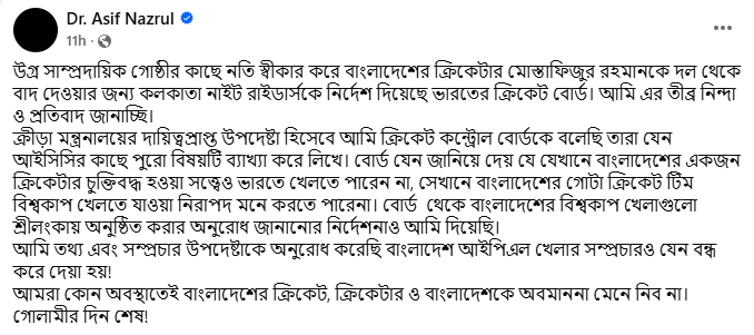 তিনি আরও লেখেন, ‘ক্রীড়া মন্ত্রণালয়ের দায়িত্বপ্রাপ্ত উপদেষ্টা হিসেবে আমি ক্রিকেট কন্ট্রোল বোর্ডকে নির্দেশ দিয়েছি, তারা যেন আন্তর্জাতিক ক্রিকেট কাউন্সিলের (আইসিসি) কাছে পুরো বিষয়টি লিখিতভাবে ব্যাখ্যা করে। বোর্ডকে জানাতে বলা হয়েছে—যেখানে বাংলাদেশের একজন চুক্তিবদ্ধ ক্রিকেটার ভারতে গিয়ে খেলতে নিরাপদ মনে করতে পারেন না, সেখানে বাংলাদেশের পুরো ক্রিকেট দল কীভাবে বিশ্বকাপ খেলতে ভারতে যাওয়াকে নিরাপদ ভাবতে পারে।’